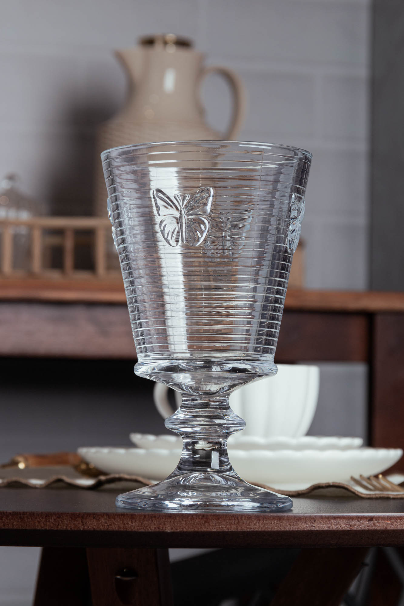 As taças apresentam um design sofisticado com detalhes de borboleta, que adicionam um toque de elegância à mesa.