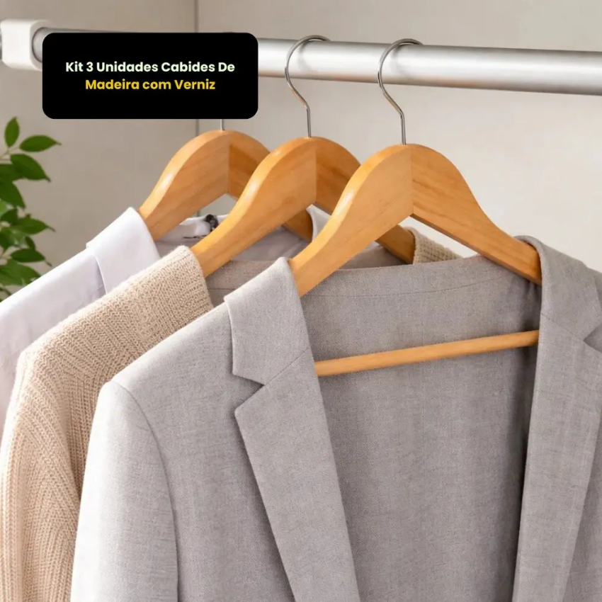 Organize seu guarda-roupa com elegância e resistência. O Kit com 3 Cabides de Madeira com Verniz é ideal para quem busca durabilidade e melhor conservação das roupas.