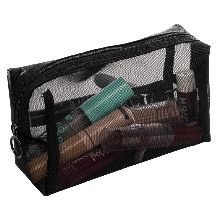 O material de tela permite visualizar facilmente o conteúdo da necessaire, facilitando a localização dos itens e proporcionando ventilação adequada.