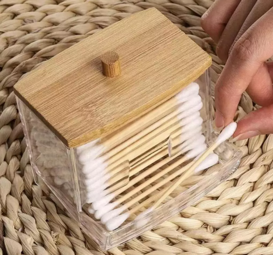 A tampa de bambu não apenas adiciona um elemento natural e estético, mas também protege os cotonetes contra poeira e sujeira.
