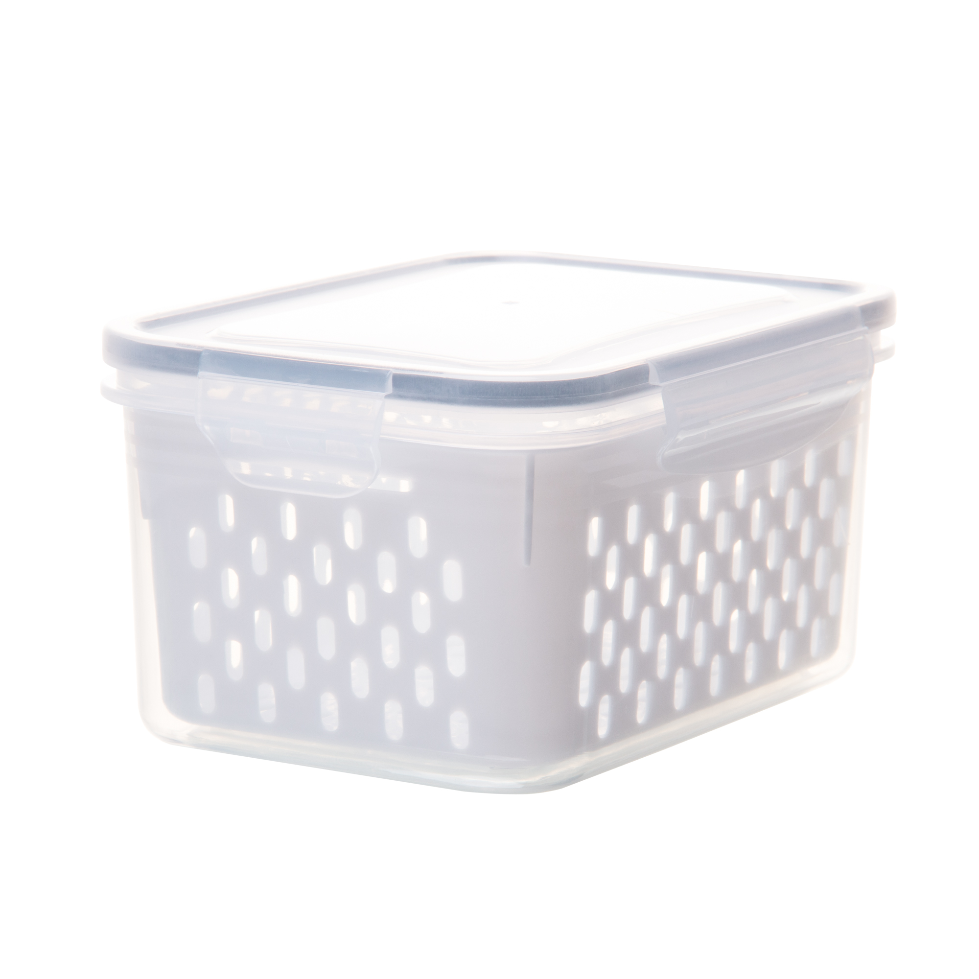 O cesto branco encaixa-se perfeitamente no pote, facilitando a lavagem de alimentos, como frutas ou folhas de salada, diretamente no recipiente. Uma solução eficiente para otimizar o preparo de alimentos frescos.