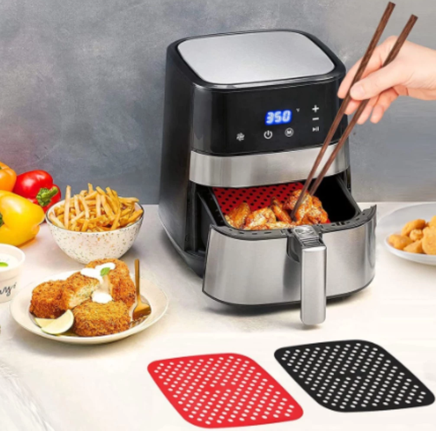 Forro de silicone para fritadeiras elétrica. Acessório para fritadeira a ar: uma maneira simples, rápida e conveniente de fazer refeições deliciosas enquanto protege sua cesta de fritadeira e facilita a limpeza. O conjunto de revestimento da fritadeira é feito usando apenas silicone de qualidade alimentar, sem depender de Bpa ou plástico. Eles usam um design perfurado para oferecer fluxo de ar ideal para distribuição igual de calor e podem ser utilizados como suportes para vaporizadores ou fritadeiras com cestos. Resistência a alta temperatura 230 graus. Reutilizável e multifuncional; Não pegajoso; Não tóxico e seguro; Os forros podem ser facilmente cortados para caber no tamanho, se necessário. Cor: vermelho e preto Formato: Quadrado Medidas: 21cm X 0,2cm Material: Silicone Embalagem: contém 1 unidade